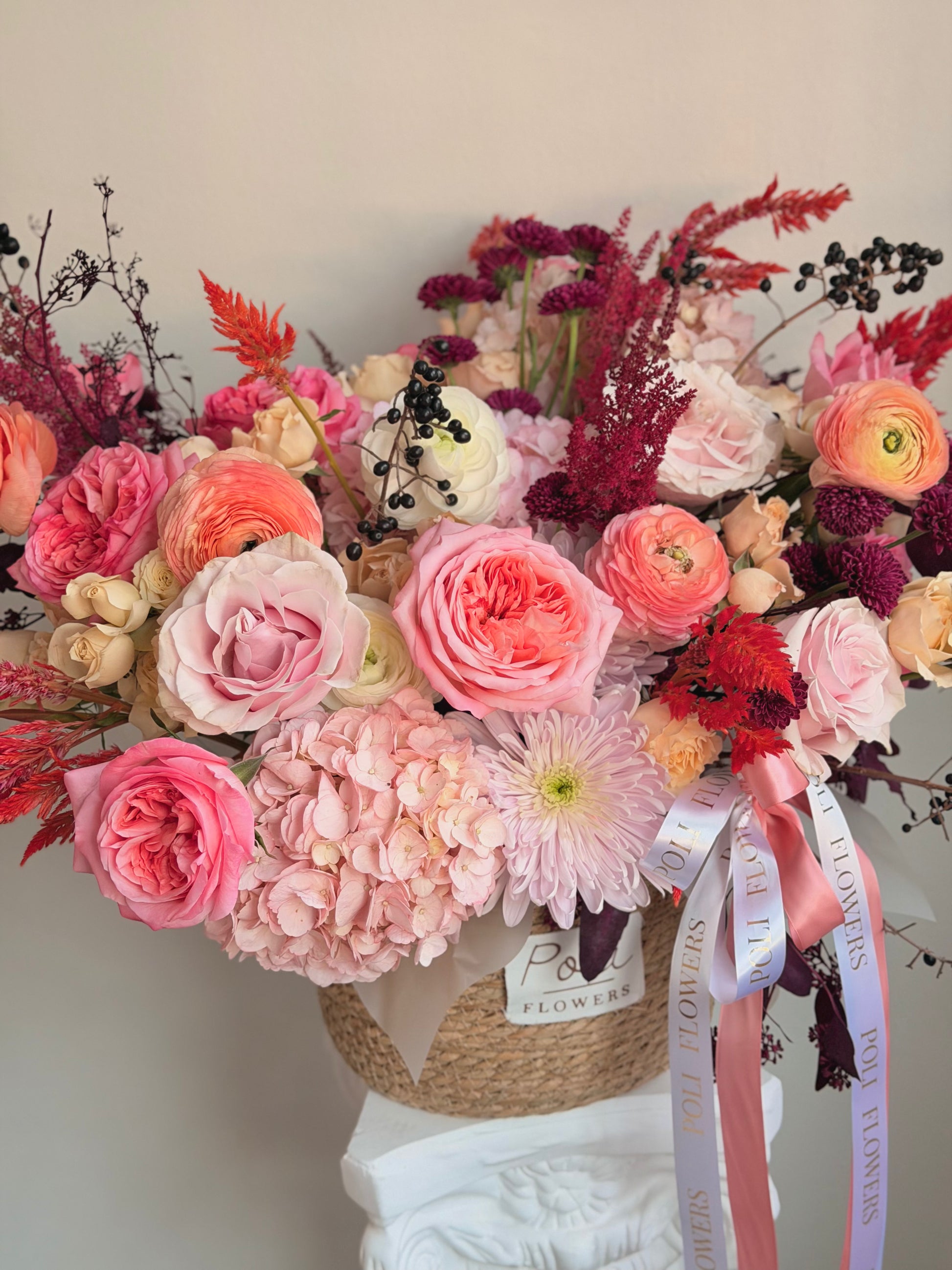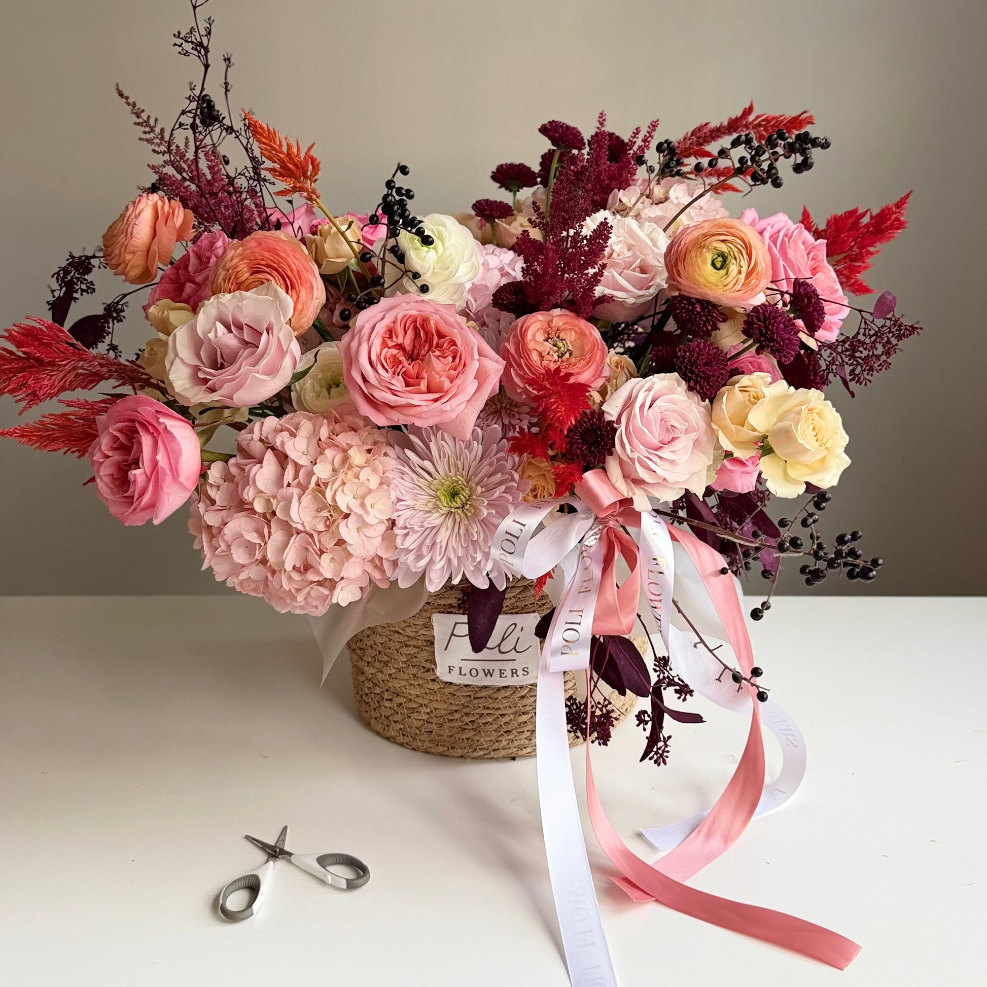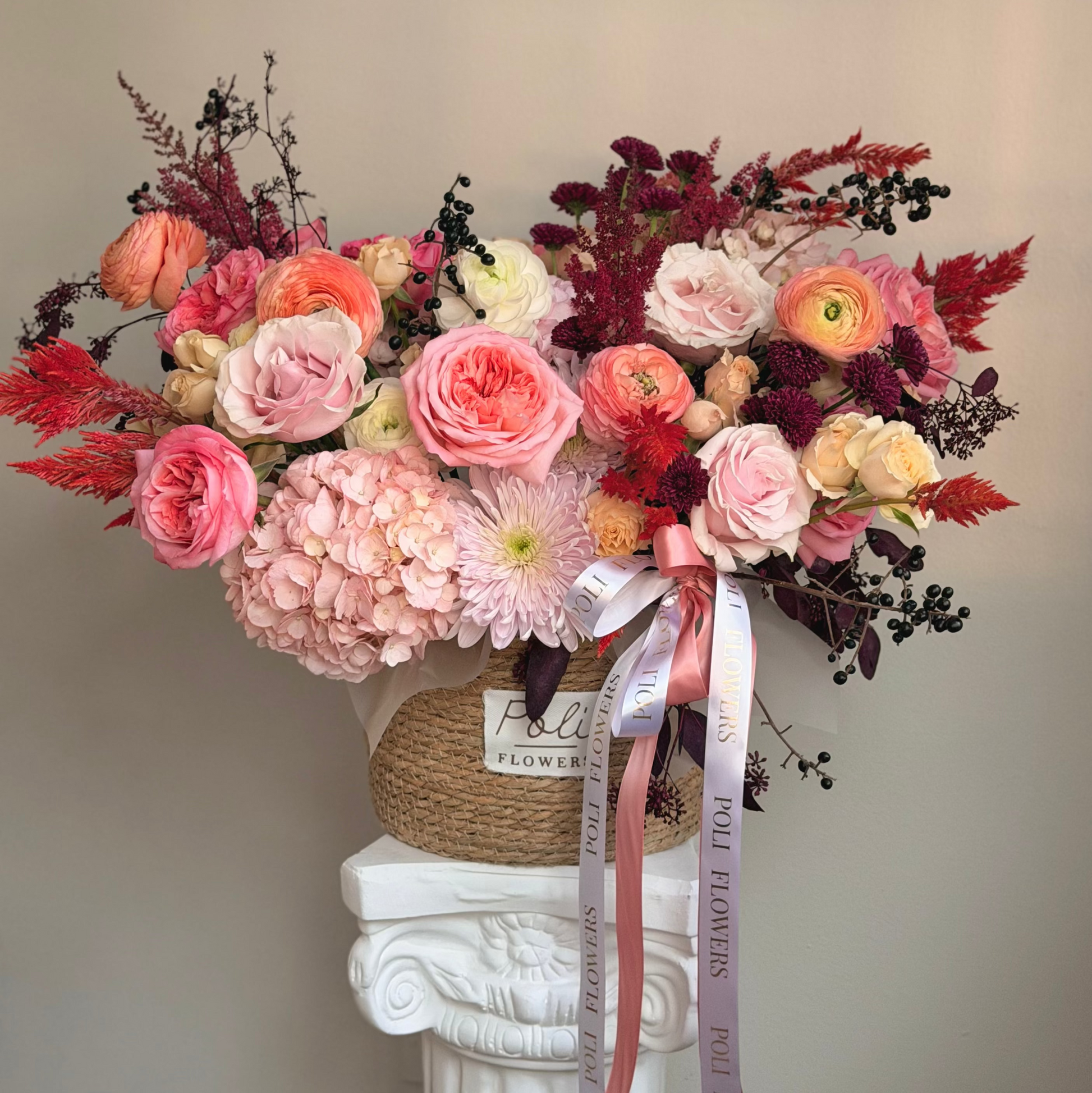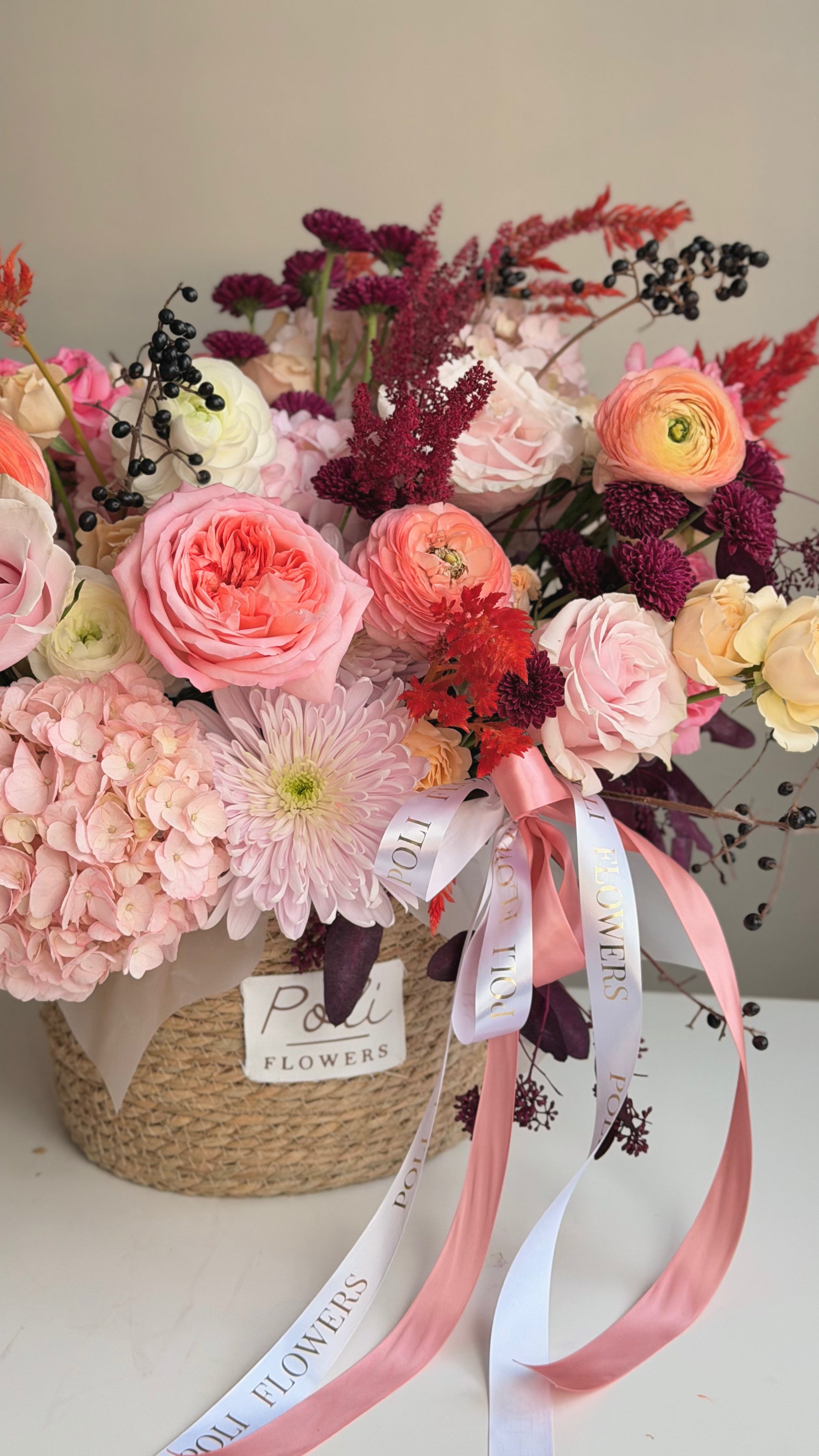 A breathtaking garden-style arrangement designed in soft blush, peach, cream, and deep berry tones. This luxurious basket features premium roses, ranunculus, hydrangea, mums, and textural accents that create movement, volume, and an elegant airy silhouette.