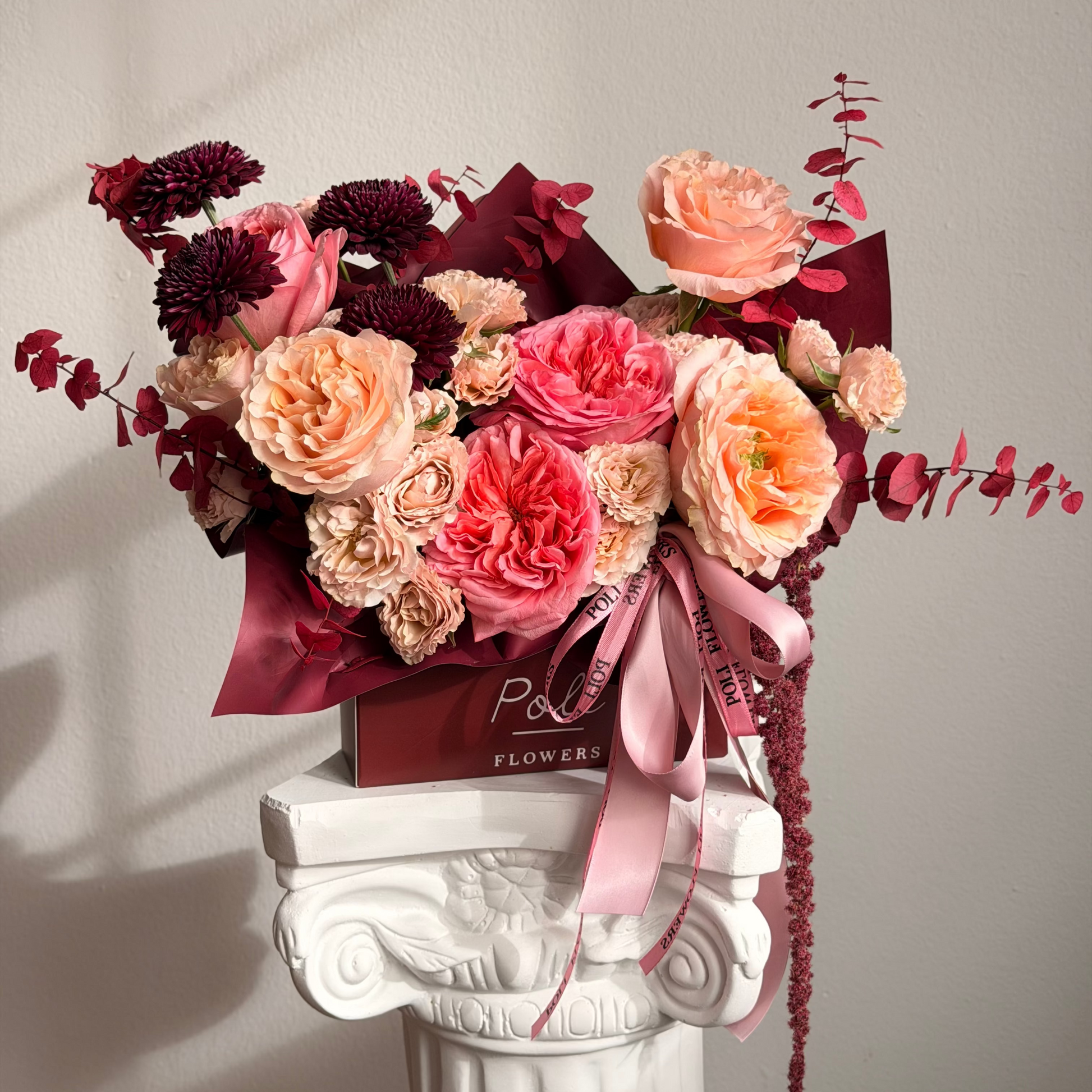 A luxurious floral arrangement designed in rich berry, blush, and peach tones. This composition features a romantic blend of premium garden roses, spray roses, mums, and textural accents — carefully arranged to create depth, movement, and an elegant silhouette.