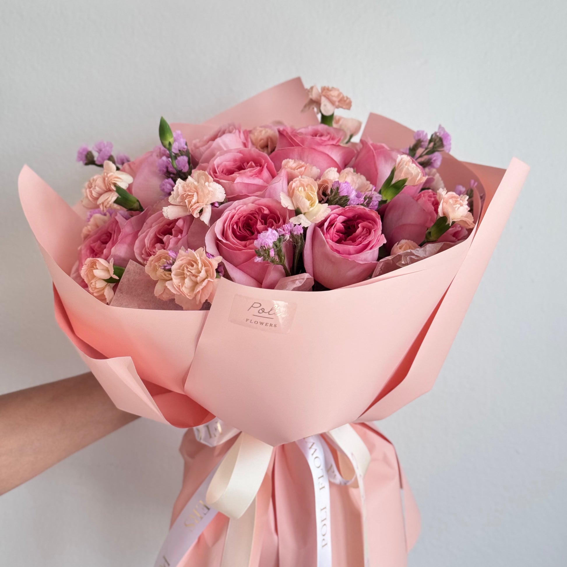 Soft, romantic, and effortlessly elegant — Blushing Peach is a bouquet that speaks the language of tenderness. Featuring lush Pink Expression roses, delicate peach carnations, and airy sprigs of lilac statice, this arrangement is a gentle nod to summer’s sweetest moments.