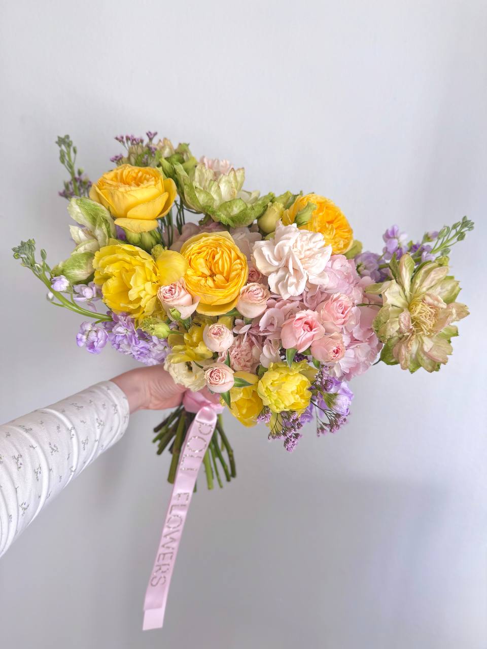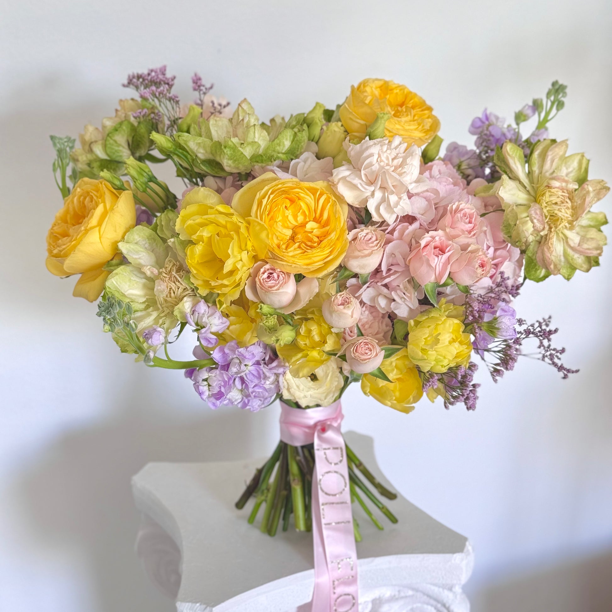 A vibrant bridal bouquet bursting with joy and color, featuring sunny yellow garden roses, delicate tulips, pastel pink spray roses, hydrangeas, lilac stock, and touches of lavender. Golden Hour captures the warmth and glow of love’s happiest moments, making it a perfect choice for a radiant, light-filled wedding day.