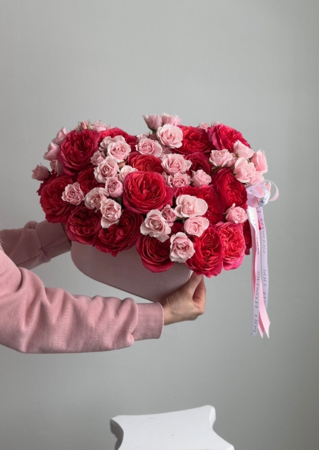 A luxurious velvet heart box filled with lush garden roses and delicate spray roses in soft pink and rich red tones.