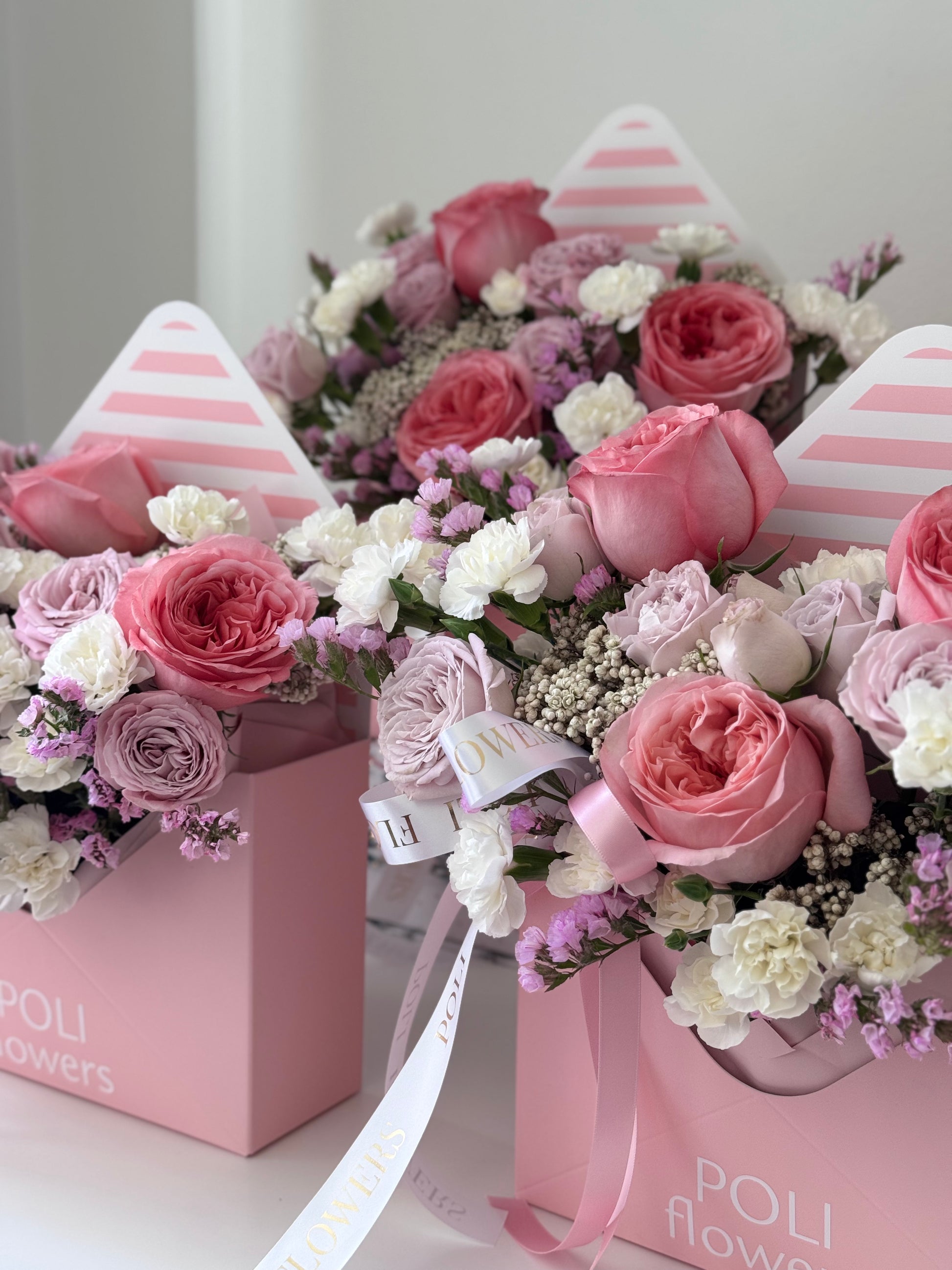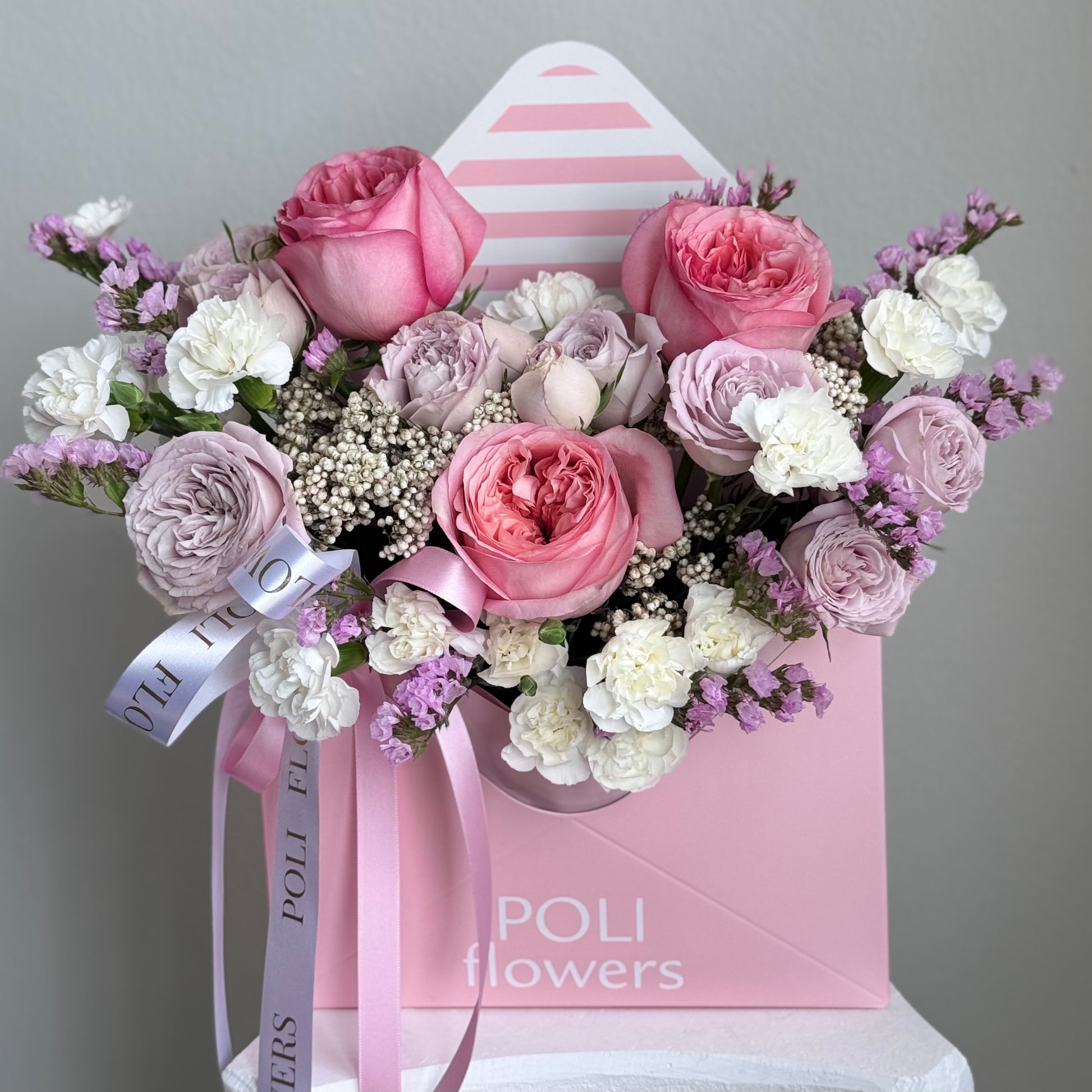 A delicate envelope of blooms that says it all without a single word. Featuring soft garden roses, statice, carnations, and seasonal accents in airy pastel tones of blush, ivory, lilac, or soft pink — depending on availability. Each arrangement is one-of-a-kind, crafted in the signature POLI flowers style using fresh flowers in the same color palette as shown.