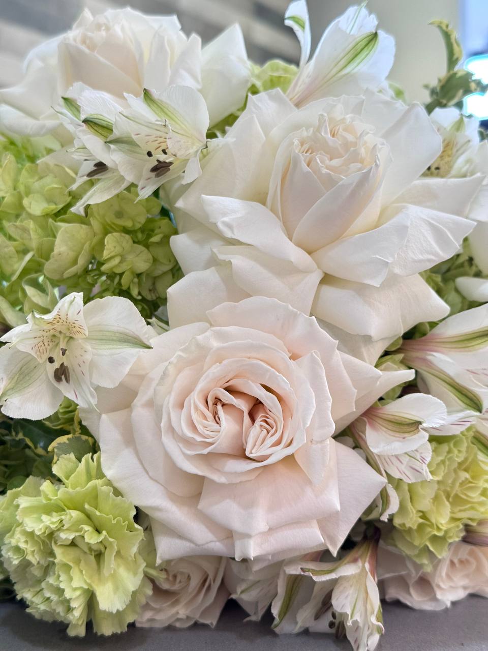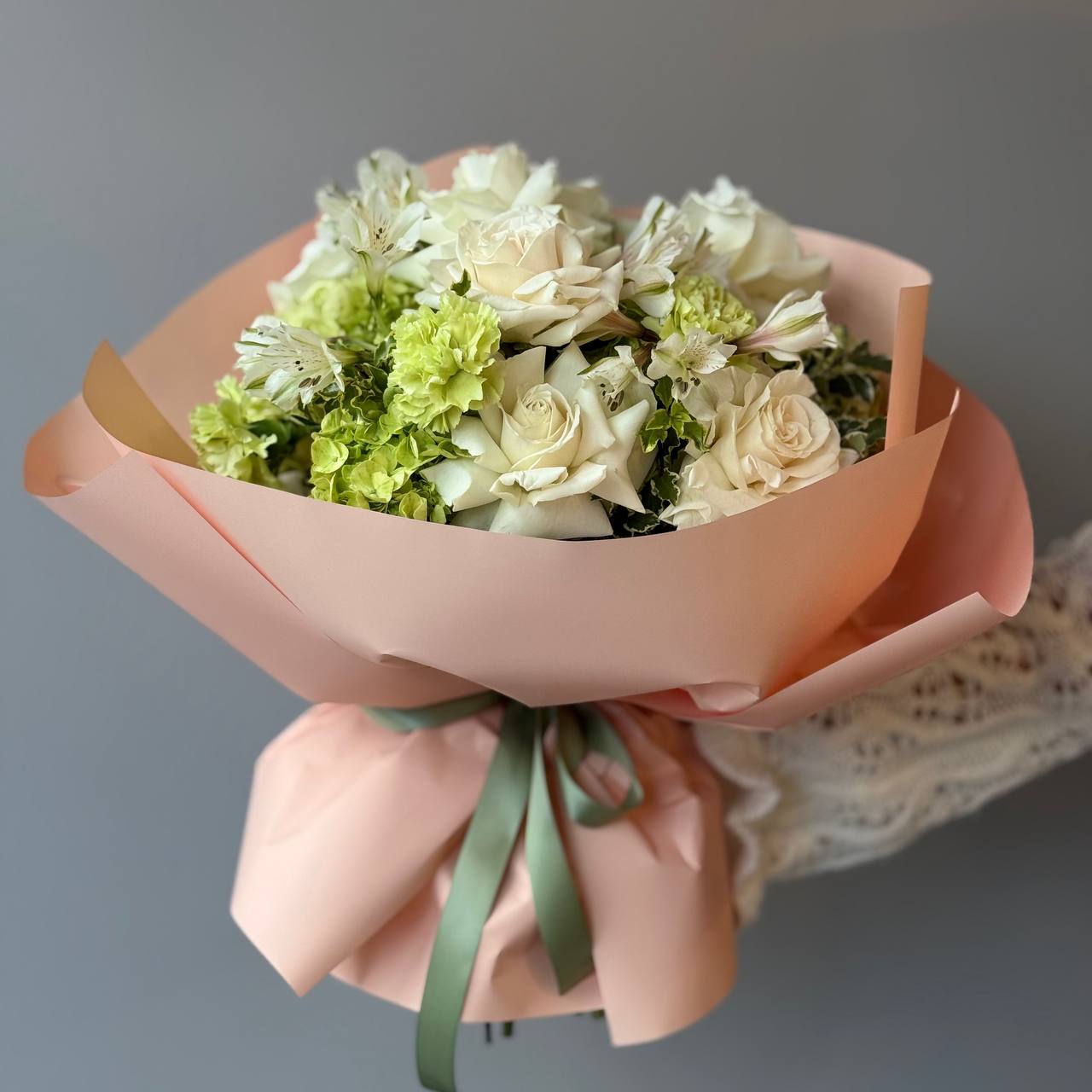 A refreshing and elegant bouquet in gentle shades of white and soft green. Featuring creamy roses, alstroemeria, and lush seasonal greenery — this arrangement evokes calm, purity, and a touch of spring breeze. Wrapped in blush pink and finished with a sage green ribbon for a refined look.
