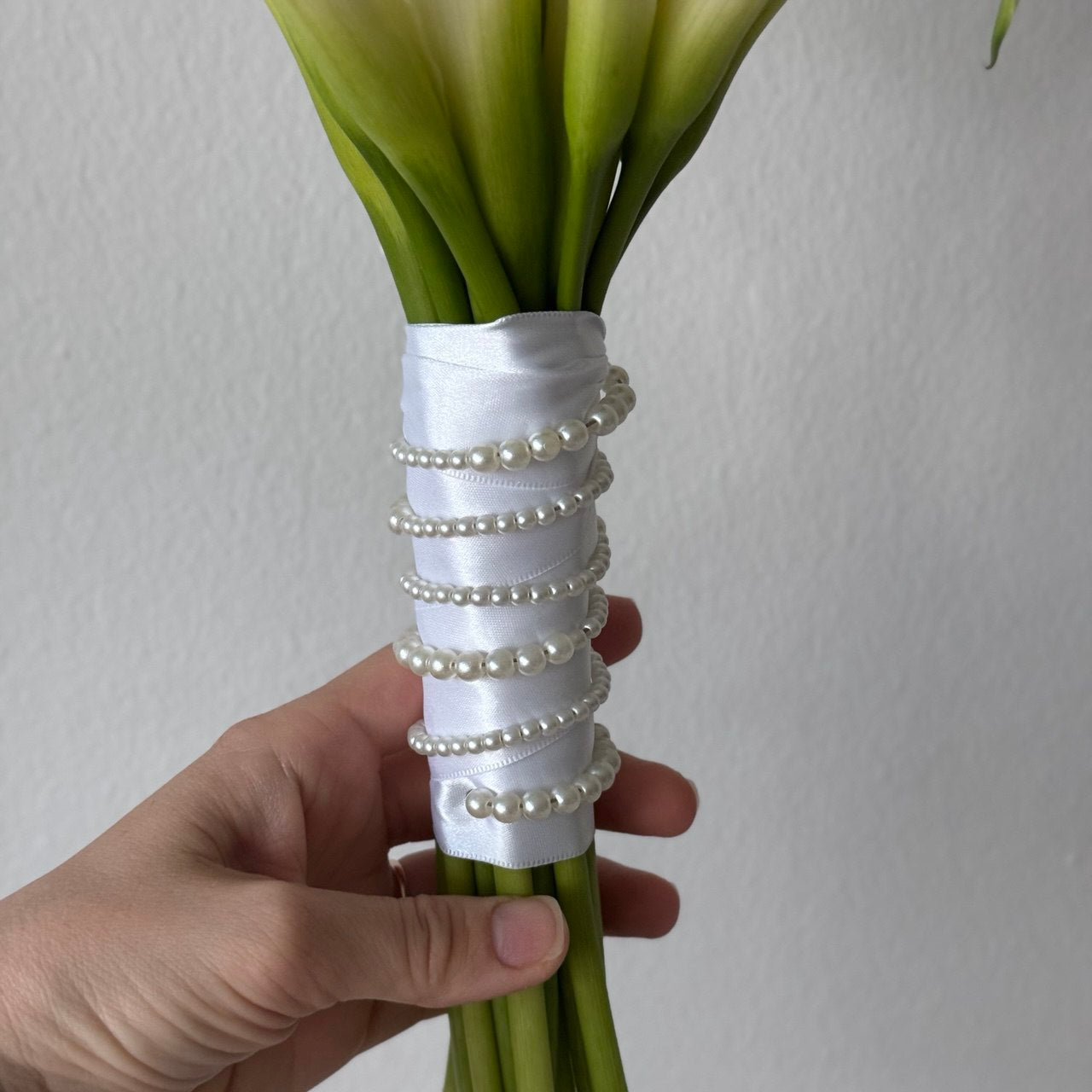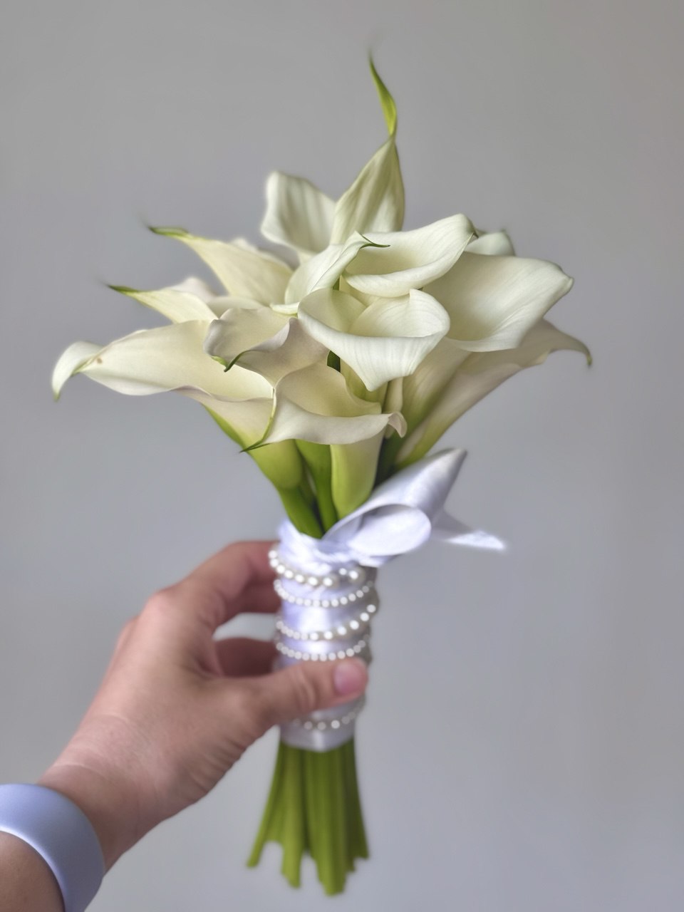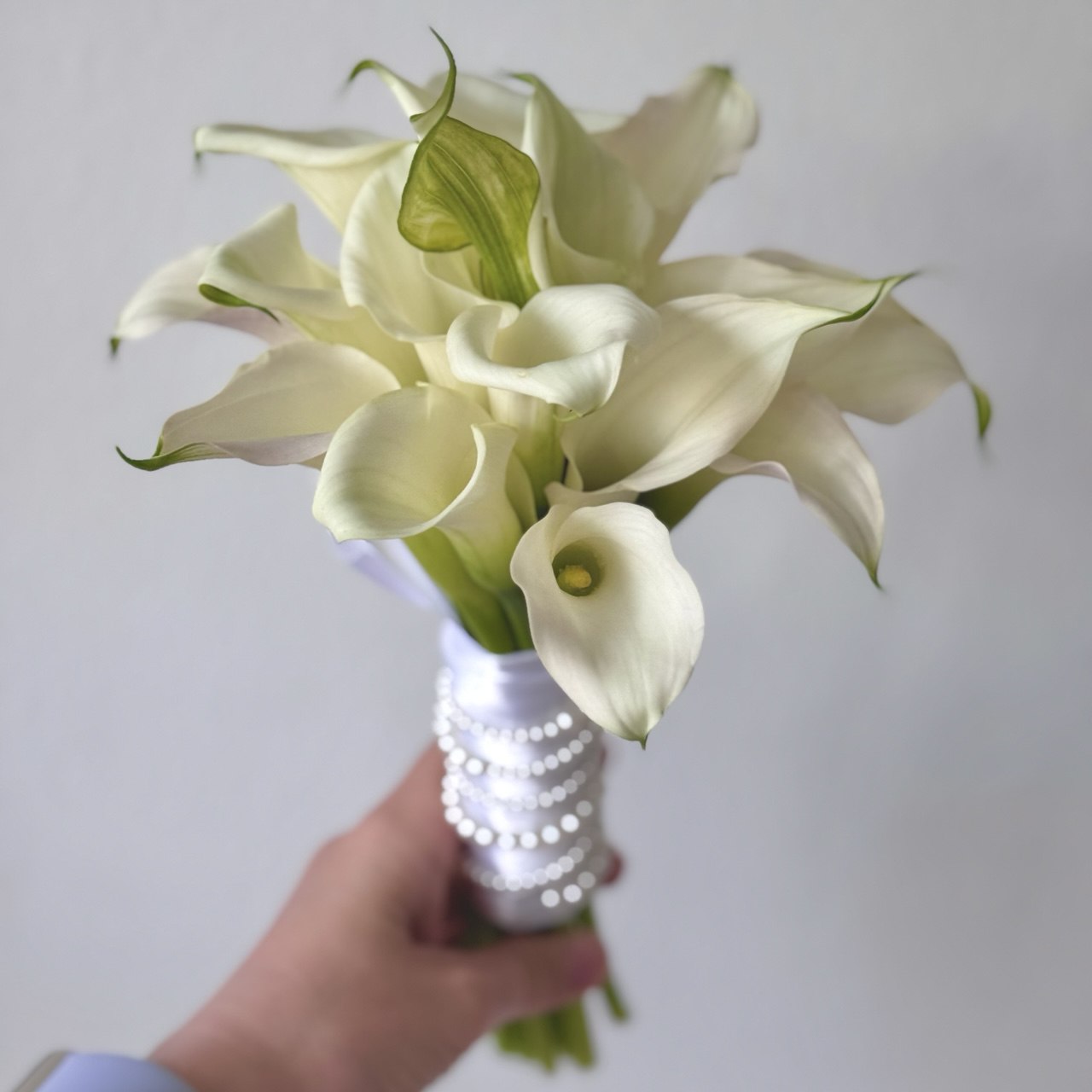 Elegant and timeless, Pure Grace is a delicate bridal bouquet featuring pristine white calla lilies — a symbol of purity, devotion, and everlasting love. Hand-tied with a satin ribbon and adorned with pearl details, this bouquet perfectly complements both classic and modern bridal looks.