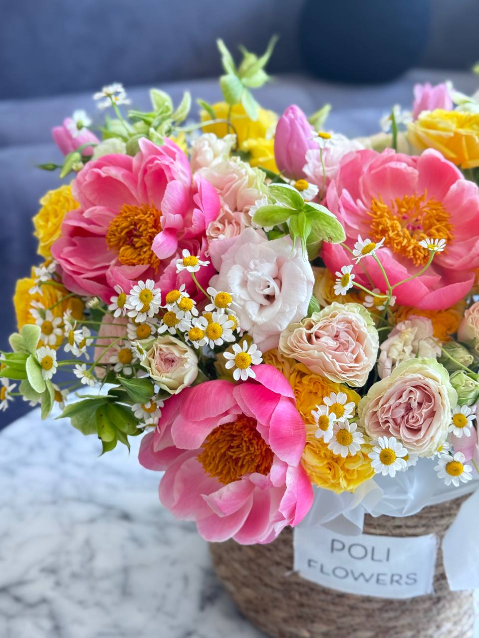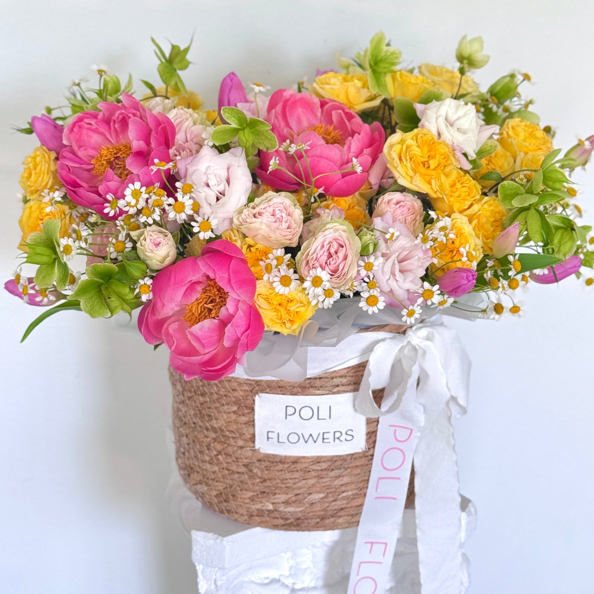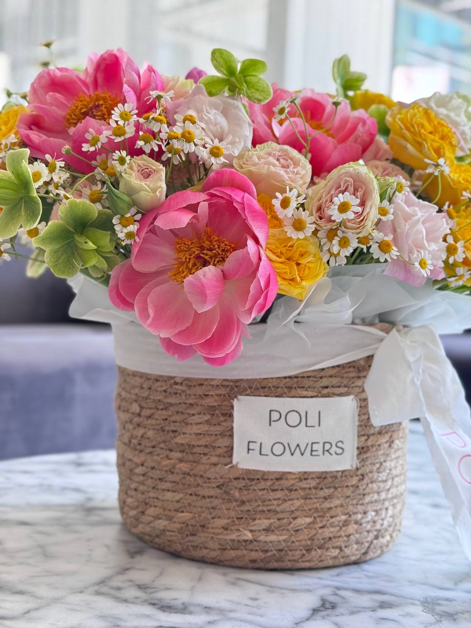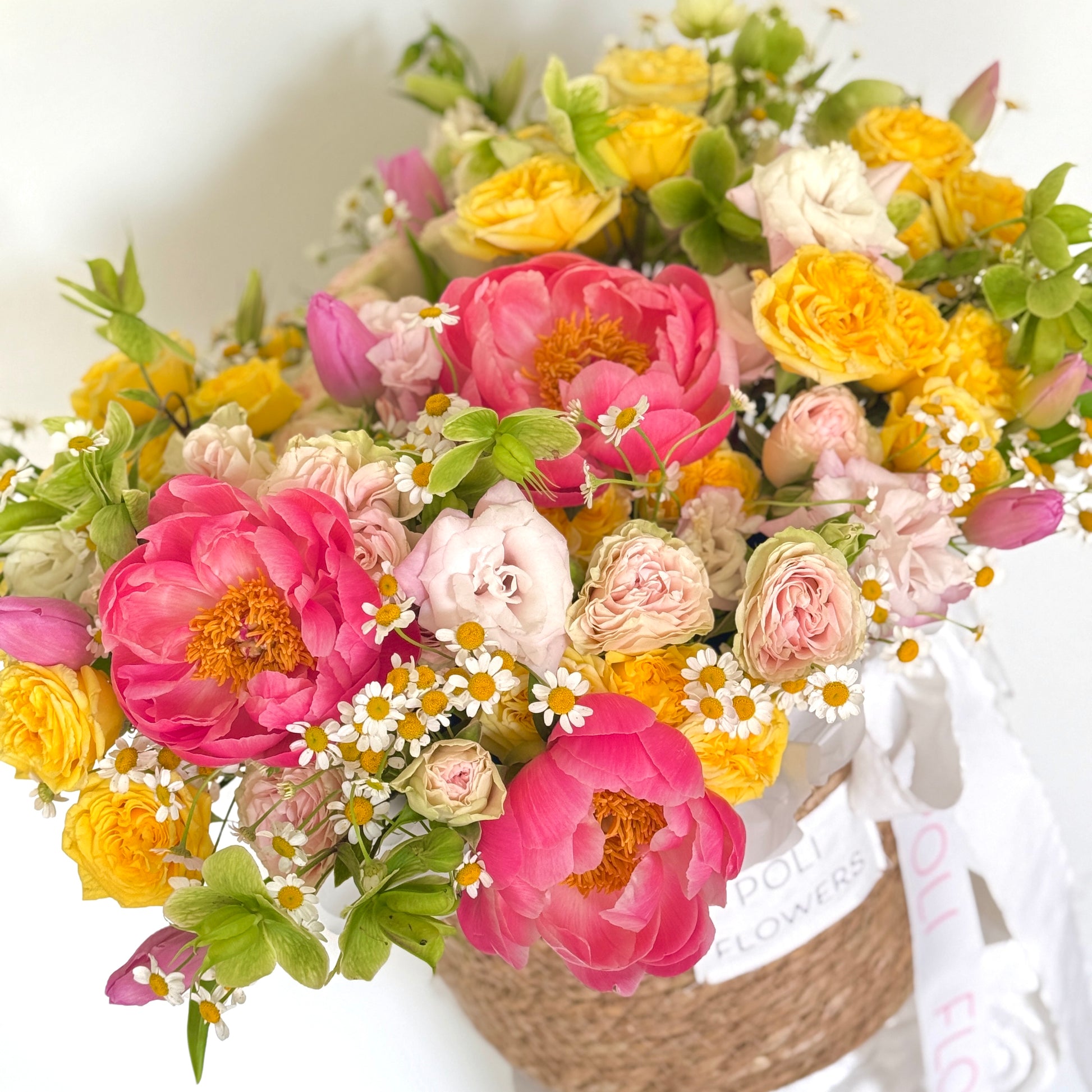 A joyful floral basket bursting with color and charm — featuring premium peonies, spray roses, chamomile, and seasonal blooms in warm shades of yellow, pink, and cream. Designed to bring pure happiness and sunshine to any day.